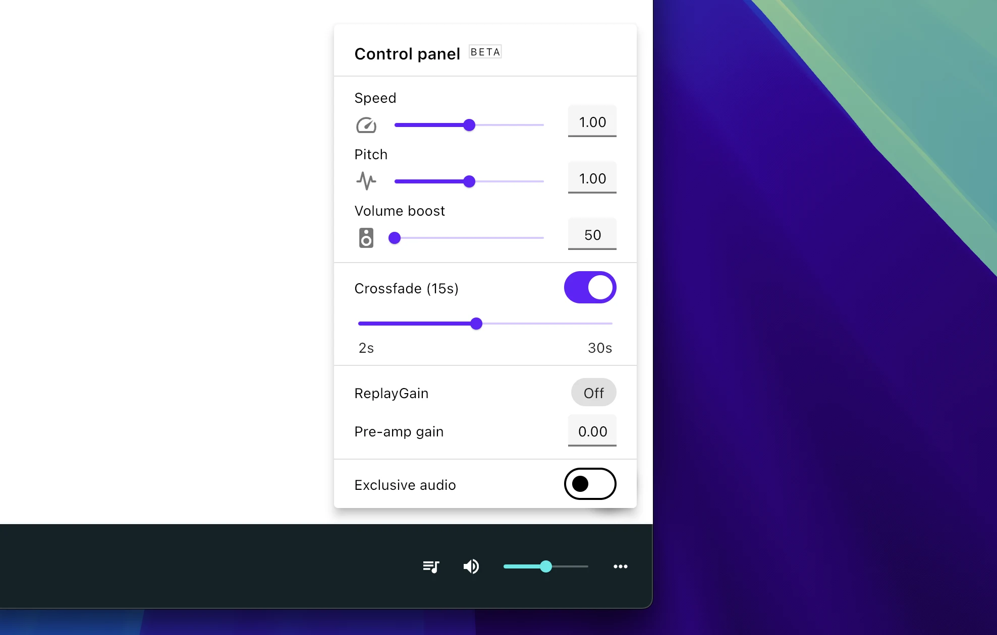 Playback speed, pitch, volume boost, crossfade, ReplayGain, exclusive mode & more.